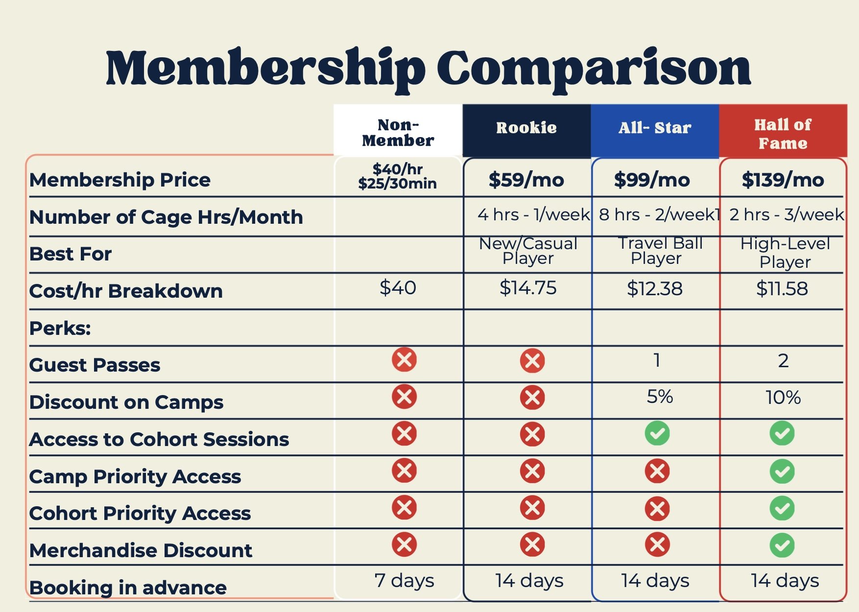 Struggling to find a designated space to get your reps in? Our memberships turn training into a routine—consistent weekly reps, priority booking before the public, and member perks like guest passes—so athletes improve faster without juggling one-off rentals. You lock predictable costs while getting 4–12 hours a month of cage time for a fraction of the cost compared to our off-the-street price of $40 per hour. Plus, faster access and less friction booking. And with our Access Guarantee, if you can’t get your reps, we make it right—so it’s risk‑free to join. Choose your tier, book your time, get better every week.